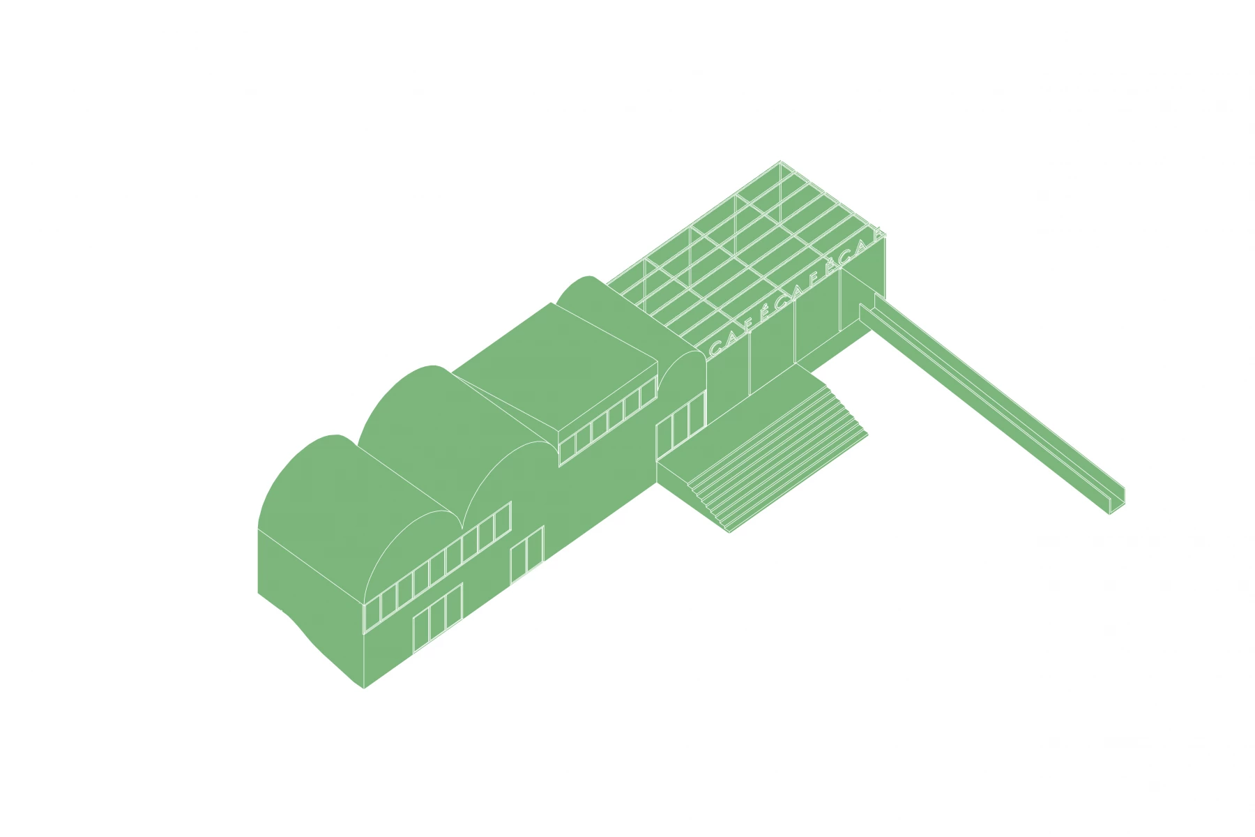 Die Grundstruktur des Gebäudes wird in Holzbauweise und Brettstapeldecken ausgeführt. Die einfache und klar im Raster angelegte Konstruktion sorgt für eine effiziente Bauart und gleichsame Nutzungsoffenheit. Umsäumt wird das Gebäude durch eine leichte Stahlkonstruktion und einem Vordach aus Wellblech, welche für den vorgesehenen Ausbau bereits zukünftige Anschlusspunkte bereitstellt.