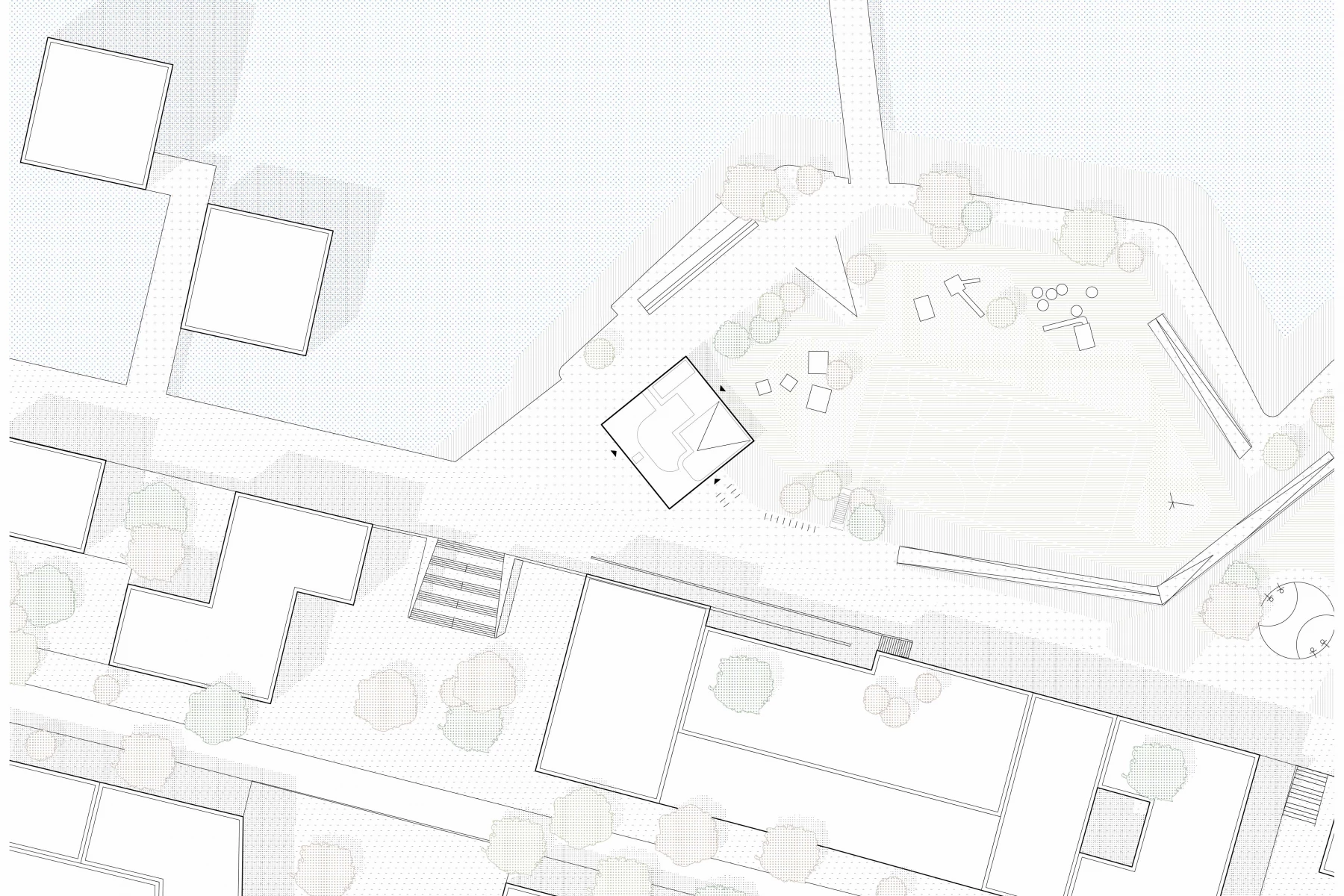 Der Entwurf des Stadtteilhauses orientiert sich in Lage und Ausrichtung genau am Baumbestand – kein Baum wird gefällt. Das bewusst reduzierte Raumangebot bedeutet weniger Baumaterial und weniger beheizbares Volumen - unterschiedlich temperierte Gebäudezonen reagieren auf saisonale Nutzungsbedarfe.